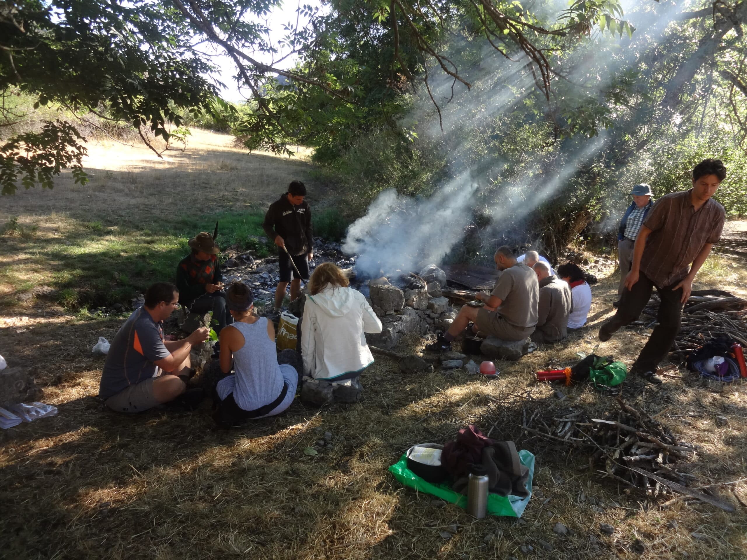 Nous cheminons ensemble dans des paysages sauvages en emportant le strict nécessaire dans notre sac à dos, en particulier un bon sac de couchage pour bien dormir. La majeure partie de notre nourriture est fournie par les plantes rencontrées. Ceci implique un renoncement à nos habitudes alimentaires – où l’abondance est souvent excessive et où la variété stimule notre appétit. Les journées se passent à explorer notre territoire, à ramasser les plantes intéressantes, à préparer nos repas sur le feu, à découvrir quelques techniques de vie primitive (feu sans allumettes, cordes naturelles, cuillères, outils de pierre, etc.)… Tout le monde participe aux différentes activités: aller chercher du bois, de l’eau, construire un abri, préparer la soupe aux herbes sauvages, confectionner des galettes de tussilage… Suivant le temps, nous dormons à la belle étoile ou sous un bivouac improvisé.